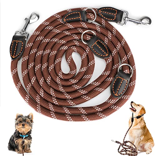 Hundkoppel för stora och medelstora hundar – justerbart dubbelt koppel av nylon med 2 karbinhakar och 3 ringar – 3 m x 15 mm – brun