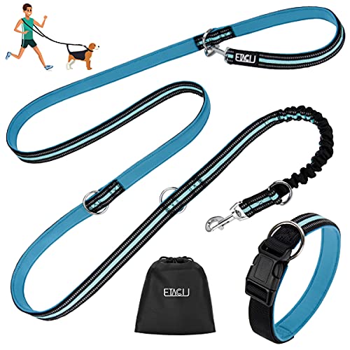 ETACCU Handsfree hundkoppel, hundpromenader, midjebälte, justerbart bälte, 3 m hundrep med halsband, träningskoppel, reflekterande sömnad, dubbelt koppel för löpning, promenader, vandring (blå)