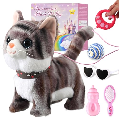Marsjoy grått koppel promenad kattset sjungande som spinner och mjauar animerad plyschrobot kattunge rörlig realistisk gosedjur, fjärrkontroll söt kawai robotkattunge leksak för barn