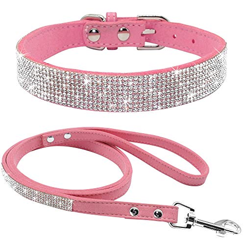 haoyueer Söt bländande glittrande elegant fint mjukt mocka läder bling strass kristall smyckat husdjur katt hund valp halsband hund koppel kombo set (M, rosa)