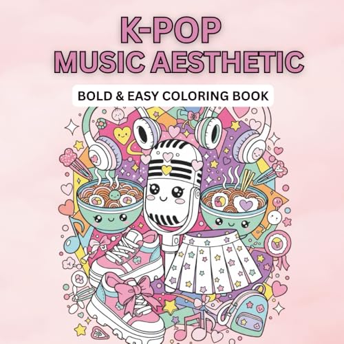 K-Pop Coloring Book for Teens: Korean Pop Music Aesthetic: 50 Easy Bold Line Coloring Pages with Cute Outfits, Microphones & Kawaii Food - Adult Coloring Book for Stress Relief