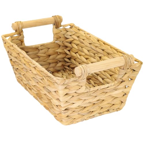 HMF Förvaringskorg med trähandtag, korg flätad av vattenhyacint | lång och kantig | 30 x 20 x 12 cm