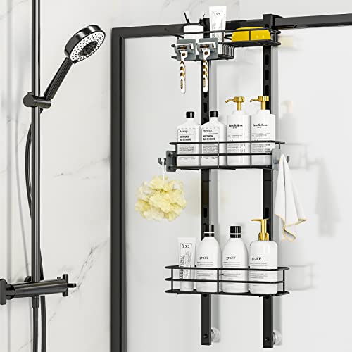 ODesign Justerbar över dörren duschhylla organiserare med 4 krokar, rostfri 3 nivåer hängande korghylla med sugproppar—svart