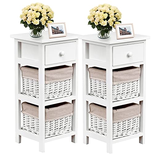 GIANTEX Uppsättning av 2 Nattduksbord Med Låda och 2 Korgar, Antik Korgbyrå, Nattkonsol, Korghylla, Massivt Trä Sidoskåp för Sovrum