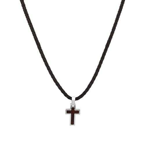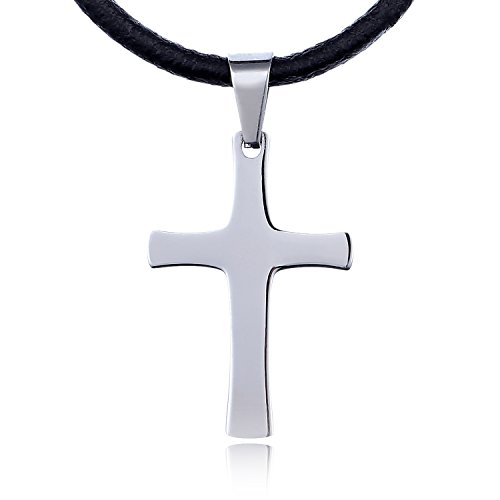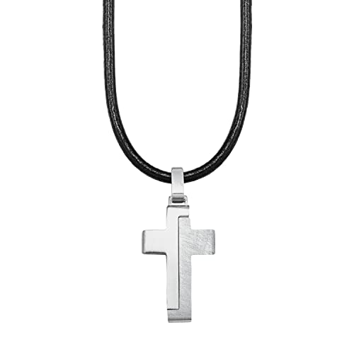 DonDon Läderhalsband med rostfritt stål kors hänge i en svart sammetspåse