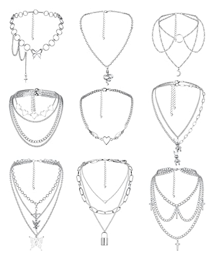 Kakonia Punkkedja set för kvinnor flickor män pojkar lager kors hjärta lås fjäril orm måne kanin hänge gotiskt choker halsband silver tjock kedja uttalande Y2K emo, Silver