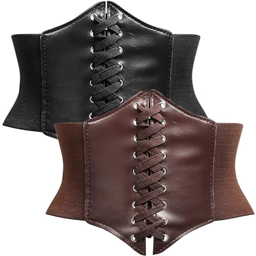 peiyee Korsett, bälte, korsett för kvinnor, 2 stycken, medeltida snörkorsett inbundent, svart och brun kvinnor, tidig waspie bälte, kardborreband, midjekorsett läderbälte, lämplig för damer, korsett