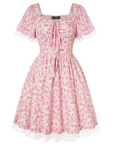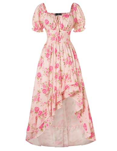 Scarlet darkness kvinnor viktoriansk blommig klänning puff ärmar smockad fyrkantig hals sommar korsett klänning, Rosa Blommig, XL