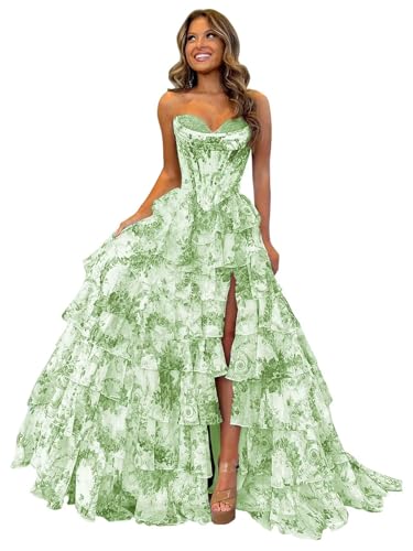 Tyll blomtryck balklänning lång slits korsett nivåindelad formell klänning axelbandslös älskling aftonklänning med fickor, Salviagrön, M