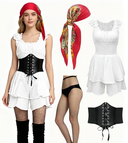minkasic 4 st medeltida piratdräkt för kvinnor med medeltida klänning, pirater, korsett huvudduk, nätstrumpor, svarta (vit, XL)