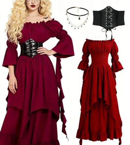 Medeltida pirater kläder damer, gotisk kostym med medeltida klänning, pirater, korsett halsband, renässans, karnevalkostym för halloween, karneval, cosplay (vinröd, S/M)