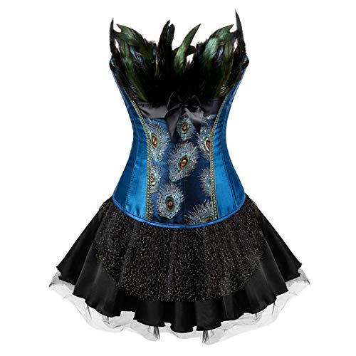 AIGOUT Påfågelfjäder fiskbenskorsett klänning – vintage domstolsbroderi, gotisk korsett blomma knopp, kort kjol, set för halloween, cosplay fest (svart, L)