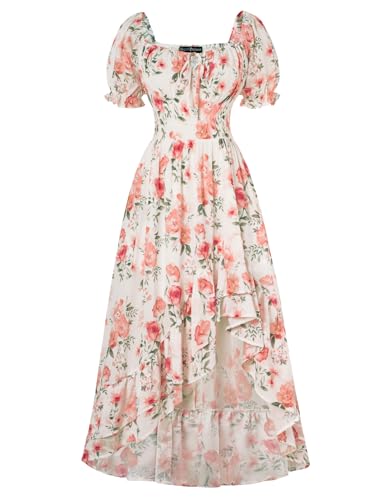 Scarlet darkness kvinnor viktoriansk blommig klänning puff ärmar smockad fyrkantig hals sommar korsett klänning, Vit rosa blommig, L