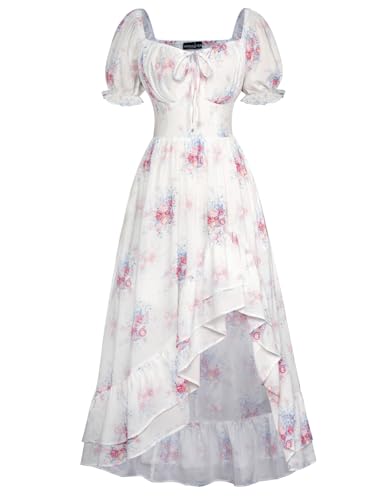 Scarlet darkness kvinnor viktoriansk blommig klänning puff ärmar smockad fyrkantig hals sommar korsett klänning, Vit rosa blommig, M