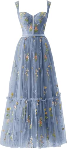 CheJooe Dam blomma broderad balklänningar spets tyll brudtärna klänning en linje korsett formell kväll balklänningar fe bröllop långa klänningar, Blå (Dusty blå), XXL