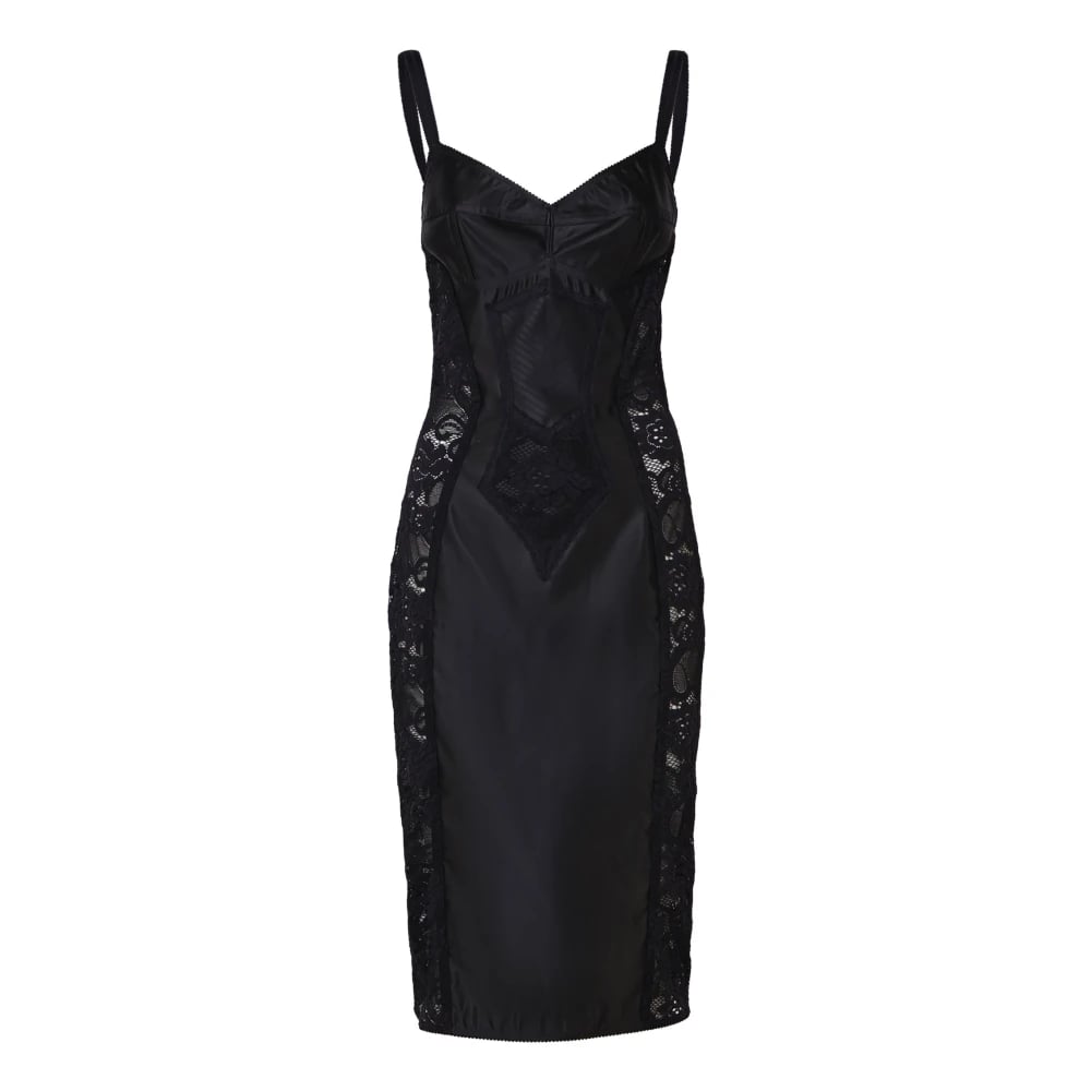 Dolce & Gabbana, Klänningar , Dam, M, Svart Satin Spets Korsett Midi Klänning
