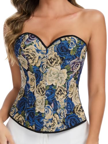 SLIMBELLE Korsett för kvinnor, renässans, helbröst, vintage, blomtryck, korsett, crop top korsett, Blå ros, L
