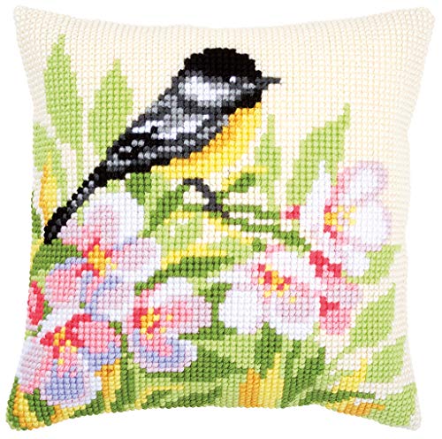 Vervaco PN-0157521 korskuddekudde Meise & Flowers korsstygn, bomull, flerfärgad, 40 x 40 cm/16 tum x 16 tum