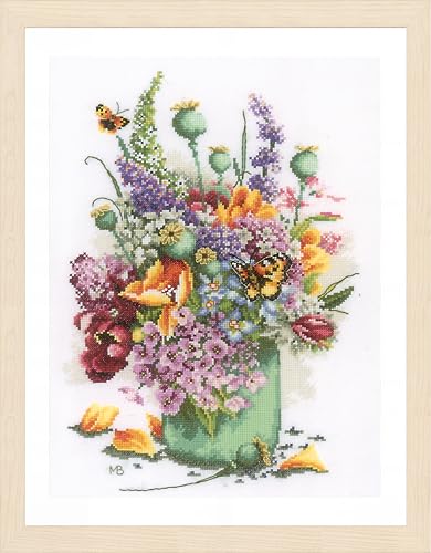 LANARTE korsstygn broderiförpackningar räknade korsstygnsbilder set flower power bouquet väggdekoration handgjorda set för vuxna ca 28 x 40 cm gör-det-själv dekoration pysselset hantverkare kreativ