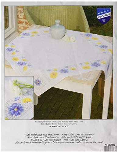 Vervaco bordsduk blommor i blå och gul siffertemönstrad förpackning i räknat korsstygn, bomull, flerfärgad, 80 x 80 x 0,3 cm