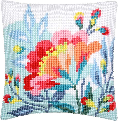 Vervaco Korsstygn, broderiförpackningar, kudde, främre för gör-det-själv brodering med broderibild på 100% bomullstyg och broderitråd, broderimallar 40 x 40 cm med instruktioner, blommor