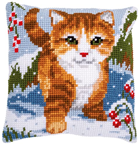 Vervaco Korsstygn broderi kit kudde framsida för självbroderi med broderingsmönster på 100% bomull och broderitråd, 15,75 x 15,75 tum - 40 x 40 cm, kattsnö