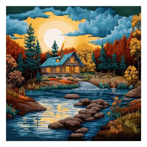 Xinpinzhou Korsstygnssats, flodlandskap, bildmönster broderiset korsstygn broderi kit nybörjare förtryckt komplett tryckt startpaket barn kors stygn broderi 40 x 40 cm