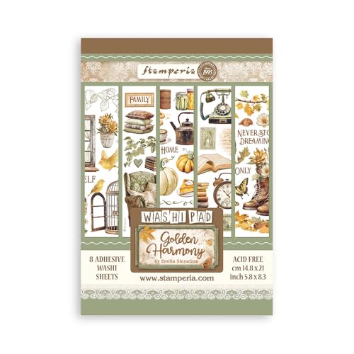 Stamperia – Washi Pad för scrapbooks, album, kort, bullet journals och more, genomskinlig och lätt att klippa, akid fri, perfekt för hobbyer, hantverk och gåvor (Golden Harmony) (A5) (8 ark)