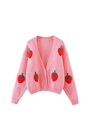 SERUMY Cardigan lös söt jordgubbe broderad stickad cardigan damtröja höst ny långärmad temperament kort topp