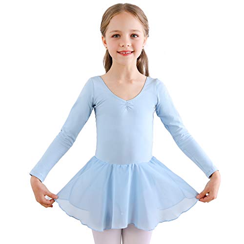 Barn balettkläder flicka balettklänning kort ärm långa ärmar balettklänning balettdräkt dansdräkt bomull med chiffong rock tütü (110–120 cm, 6–7 år), blå lång ärm)