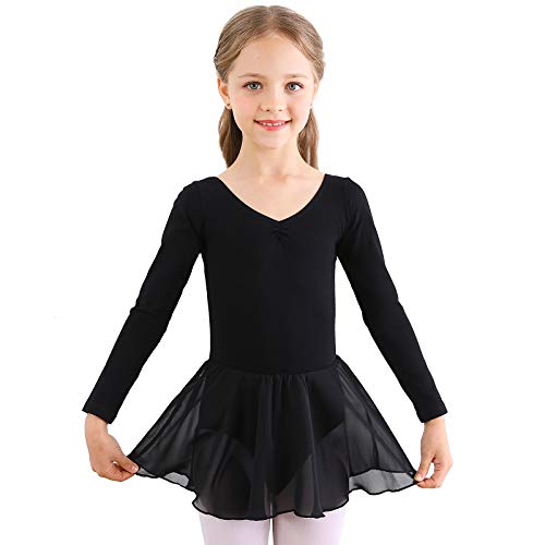 Barn balettkläder flicka balettklänning kort ärm långa ärmar balettklänning balettdräkt dansdräkt bomull med chiffong rock tütü (130 – 120–130 cm, 8–9 år), svart långärmad ärm)