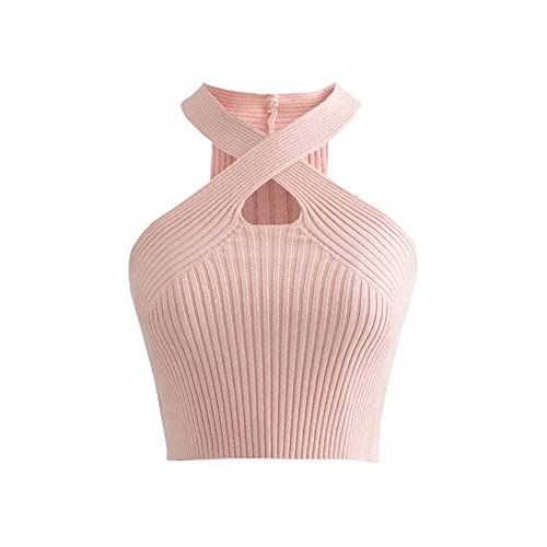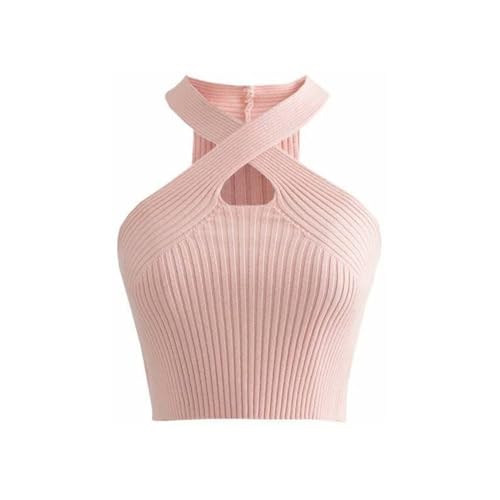 KOEMCY Crop Top för kvinnor, linne linne dam sommar sexig genombruten korsad tank toppar elegant kort ledig enfärgad väst, Rosa, one size