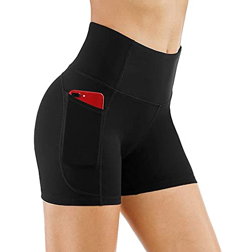 KOEMCY Korta sportbyxor, dam, hög midja, yoga, sportshorts med fickor, korta byxor, leggings, cykelbyxor, löparbyxor, ogenomskinliga, sommar, hotpants för gym, fitness, träning, yoga, svart, L