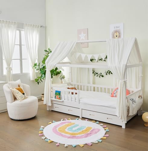 ALAVYA HOME Hussäng dekoration set 2 sänghimmel flaggirlang och gardiner set om 2 korta gardiner 100 x 150 cm, GOTS ekologisk muslin bomull, barnrum favoritplats för flickor och pojkar – vit