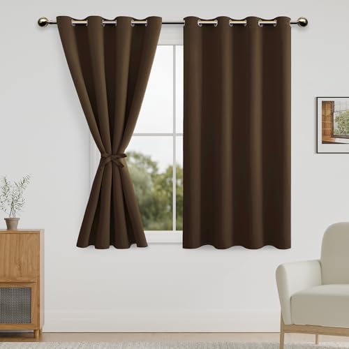 DWCN Mörkläggning korta gardiner för sovrum med bindningar – mörkläggning av rum, öljett topp fönstergardiner för vardagsrum, 132 x 114 cm längd, brun, set med 2 paneler