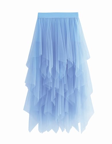 Veckad kjol för kvinnor, tyllkjol, asymmetriska kjolar, kort skater-kjol, midikjol, sommarkjol, Himmelsblått, one size