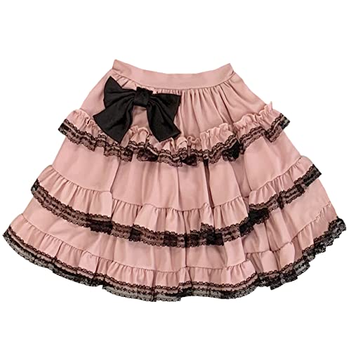Lolita minikjol tonårstjejer söt rosett lager spets volang korta skater-kjolar elastisk midja A-linje utsvängd kjol, Rosa, one size