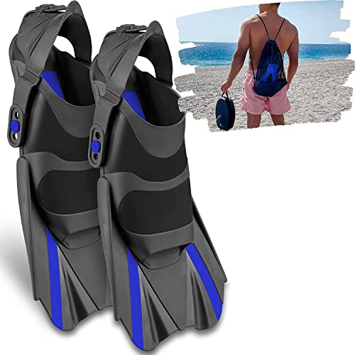 Khroom Korta fenor vuxna för snorkling storlek 36–47 | Justerbara korta fenor snorkelfenor tillverkade i Italien – premium dykfenor med axelväska | simfenor (blå, 42–47)