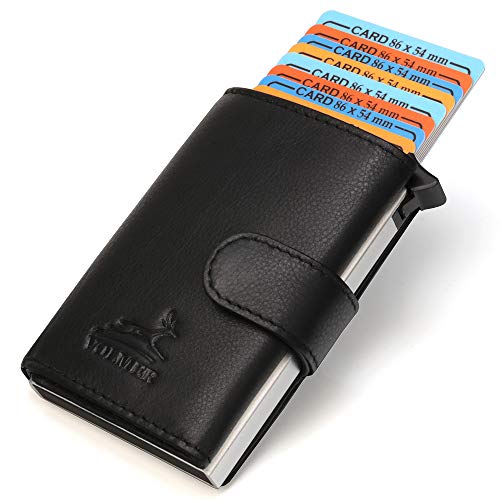 VULKIT Pop Up korthållare smal plånbok med extra läderfack RFID-blockerande metall minimalistiskt kortfodral för män och kvinnor, Svart, S, Modern