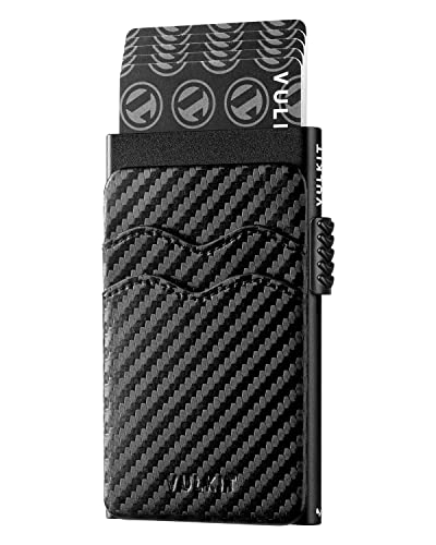 VULKIT Pop Up korthållare smal plånbok med extra läderfack RFID-blockerande metall minimalistiskt kortfodral för män och kvinnor, Kolfiber svart, S, Modern