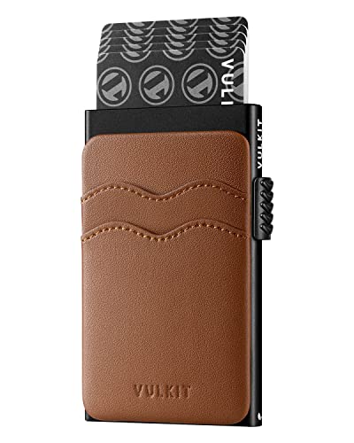 VULKIT Pop Up korthållare smal plånbok med extra läderfack RFID-blockerande metall minimalistiskt kortfodral för män och kvinnor, Brun, S, Modern