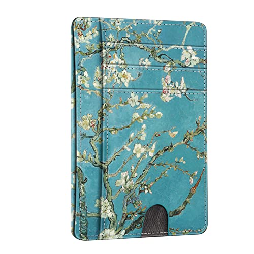 Fintie platt plånbok, konstläder, RFID-skydd, kortfodral, kreditkortshållare med ID-fönster och snabbåtkomstfack för män och kvinnor, mandelblomma