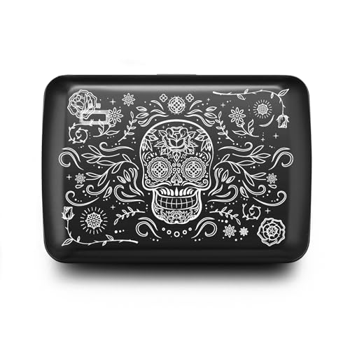 Korthållare i aluminium med metallås, RFID skydd mot bedrägeri och avmagnetisering, kompakt plånbok, Smart Case OSLO modell (Gravering Muertos)