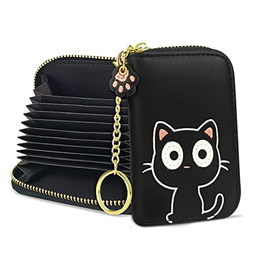 conisy Söt kreditkortshållare för kvinnor, liten läderdragkedja RFID-blockerande korthållare plånbok med avtagbar nyckelring (svart katt)