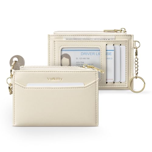 Vulkitty smal korthållare för kvinnor med nyckelring och ID-fönster, minimalistisk plånbok RFID-skyddad för kort, sedlar, nycklar och mynt, Vitt, Minimalst