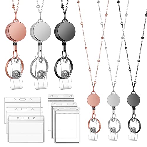 Cobee 3 st/set infällbar märkesrulle snodd med ID-hållare, halsband snodd med transparent ID-korthållare och nyckelring, vattentät namnkorthållare (roséguld, svart, silver)