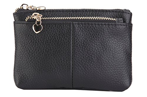 Dam äkta läder blixtlås mini myntväska med nyckelring trippel dragkedja korthållare plånbok, Svart, Myntpåse