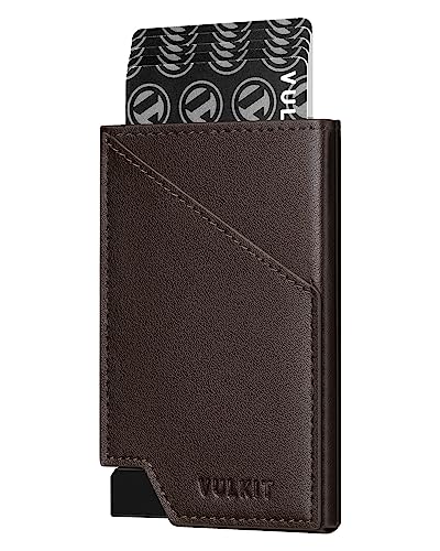 VULKIT Kreditkortshållare Plånbok RFID Blockerande Smal Aluminium Metall Bank Pop-up Korthållare Fodral med Business Money Ficka för kreditkort Sedlar och Mynt (Mörkbrun)