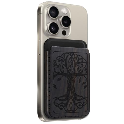 Carveit Trä Wallet kreditkortshållare Kompatibel med MagSafe, magnetisk korthållare för telefon för iPhone 15/14/13/12,för Galaxy S22/S23/S24, Pixel 6/7/8 Pro (Mörkt trä-Celtic Livets träd)