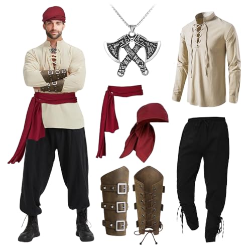 Piratkostym Herr 7-Delars Medeltida Kläder Herrset - Renässans Kostym Set med Byxor, Skjorta, Viking Pirater Huvudduk, Bälte, Handledsrem, Yxhalsband